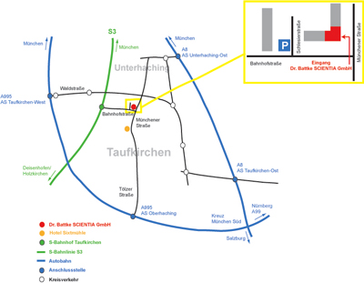 Mit dem Auto ist unser Schulungszentrum über die A99/A995 oder A8 gut erreichbar. Eigene kostenlose Parkplätze stehen direkt am Schulungszentrum gleich am Anfang der Schlesierstraße / Ecke Bahnhofstraße für Sie zu Verfügung.